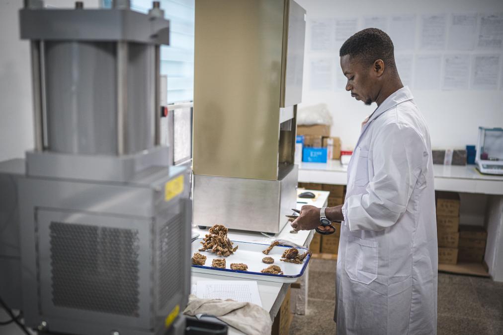 5月30日,在科特迪瓦圣佩德罗省大贝雷比镇,美兰集团橡胶加工厂的技术人员对橡胶进行质量测试。新华社记者王冠森摄