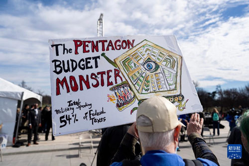2月19日,美国首都华盛顿,一名抗议者手举标语在林肯纪念堂前参加反战集会。(图片来源:新华社) 美国总统拜登日前将“2024财年国