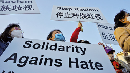 2021年3月20日,人们在美国加利福尼亚州洛杉矶县圣加布里埃尔参加集会,抗议针对亚裔的暴力和仇恨犯罪。(图片来源:新华社) 当地