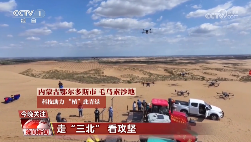 央视网消息:在内蒙古毛乌素沙地,无人机飞播、机器人栽种正当时,科技助力“植”此青绿。