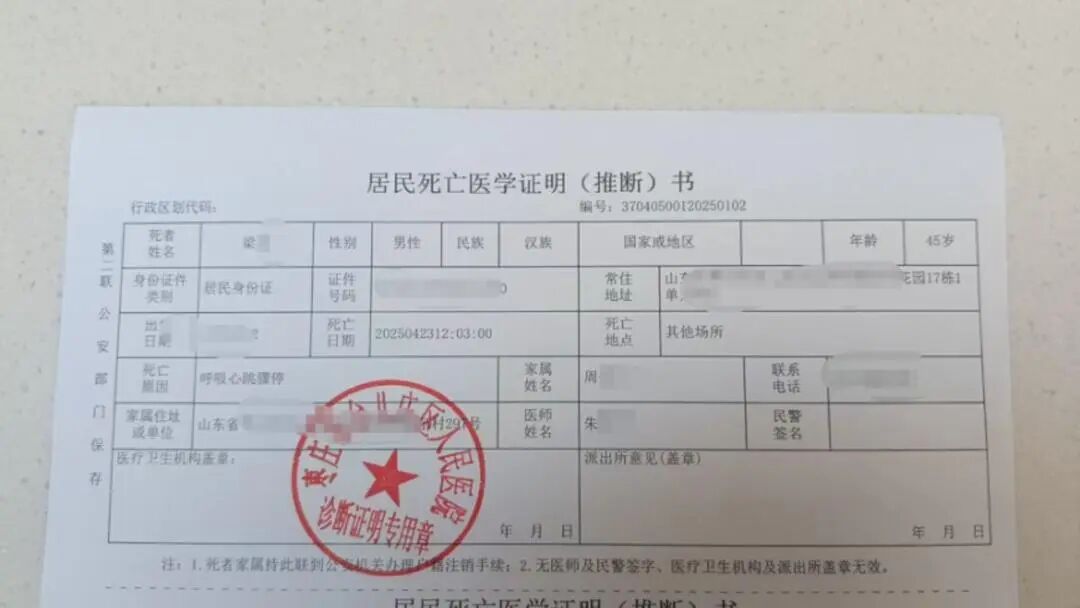 4月22日夜里,梁军下班后不知道在哪睡着了,睡了两个小时醒来,回家已经天快亮了。4月23日上午,他先骑车去了趟工地,看挖掘机施工进展,准备到点去上班时,直接在工地现场倒地不起。