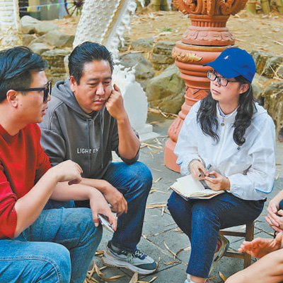 勐巴娜西乐团成员正在接受本报记者采访。 人民网记者 庄志斌摄 |