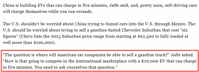 在贾菲看来,与其担心中国会通过墨西哥将汽车输送到美国,美国更应该担心的是,雪佛兰公司还给其燃油版“萨博班”车型定一个 “六位数”的价格。她表示,真正该扪心自问的是,“美国汽车公司能把这些燃油版的汽车卖向何处?它们如何能同定价在2万美元、在五分钟内充好电的电动汽车在国际市场上竞争?”