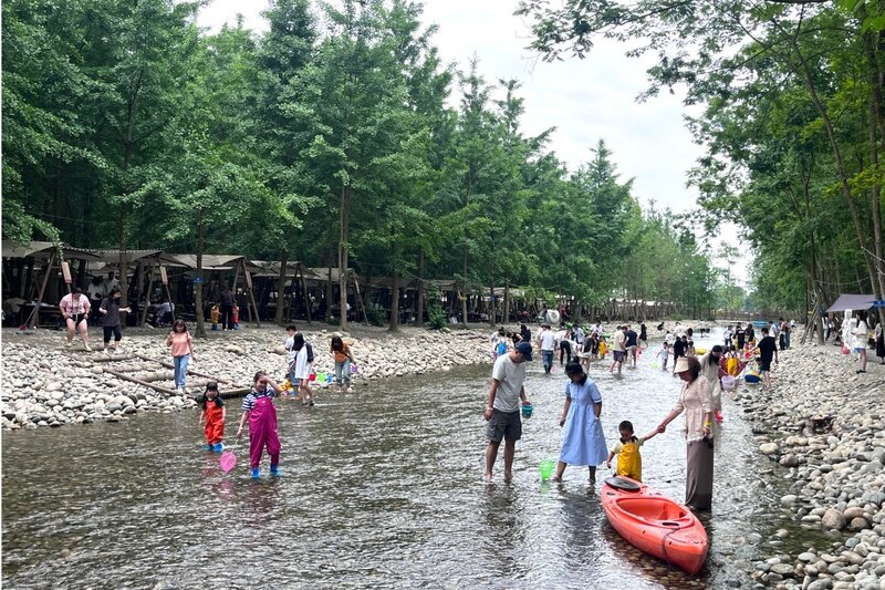 “‘露营经济’是我们的发展方向,定位是大城市周边游,辐射人群主要为城市里的家庭客户,经营模式为‘一价全包’。”“长河落日园”森林营地负责人张英杰介绍,客户所购买的入园门票涵盖了营地内的吃、喝、娱、游,既满足了大人“躺平式遛娃”的需求,也让小朋友体会到了“乡下的童年”。