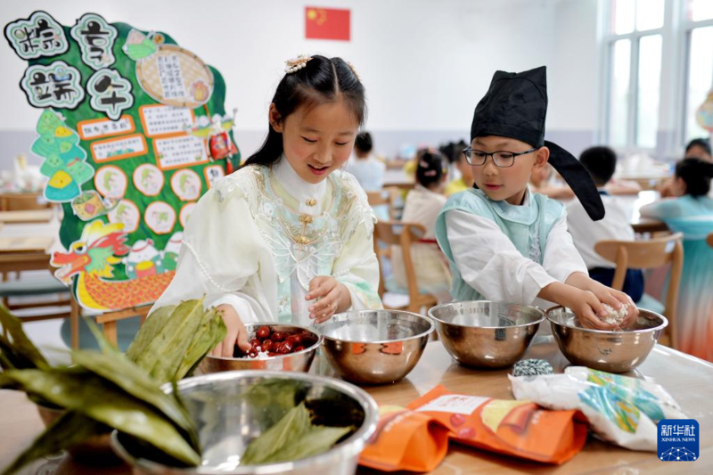 5月26日,在山东省青岛市市北区杭州路小学开展的“粽享端午”主题活动中,两名学生准备包粽子食材。