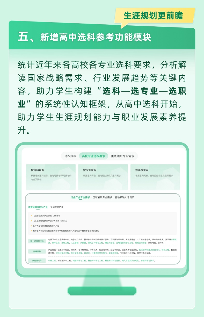 统计近年来各高校各专业选科要求,分析解读国家战略需求、行业发展趋势等关键内容,助力学生构建“选科—选专业—选职业”的系统性认知框架,从高中选科开始,助力学生生涯规划能力与职业发展素养提升。