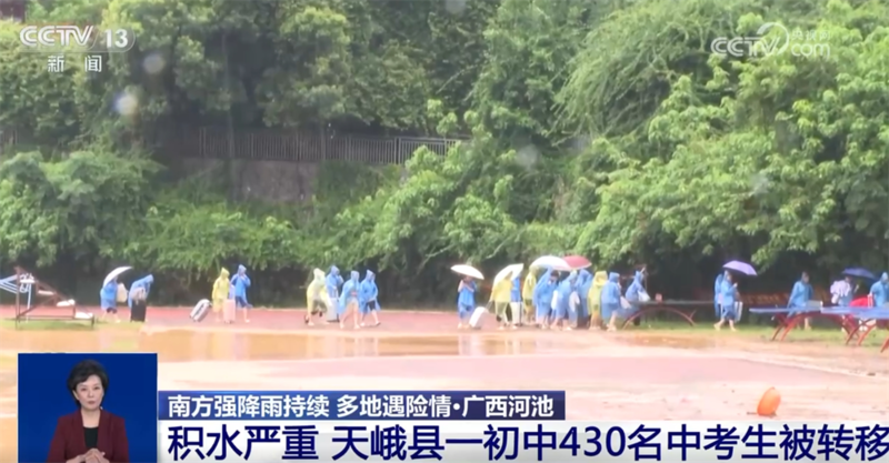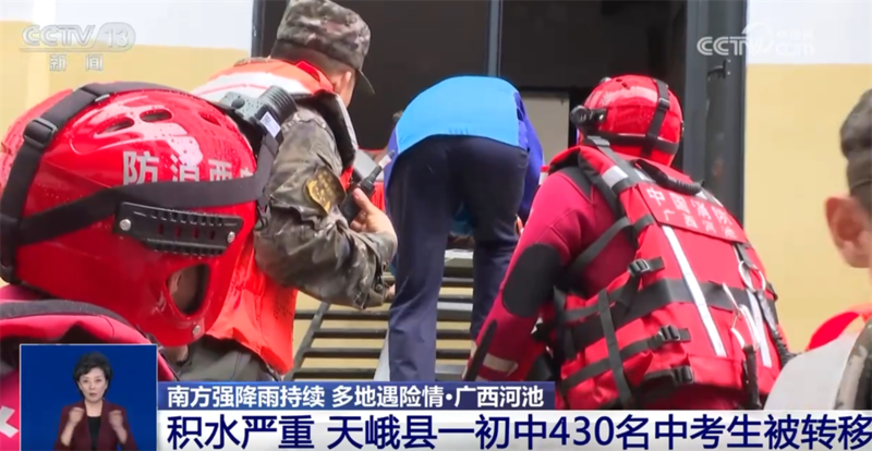 央视网消息:6月22日,广西河池市天峨县因持续强降雨引发洪水倒灌,导致城区多处严重积水。天峨县民族中学因积水严重,校内即将参加中考的430名学生被围困在宿舍楼。来看总台记者23日中午从民族中学发回的报道。