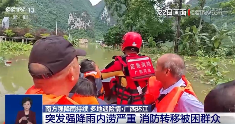 22日11时,广西河池消防救援支队指挥中心接到报警,环江毛南族自治县水源镇下南社区因强降雨发生内涝,多名群众被困。当地消防救援人员随即携带救援装备赶到现场。由于积水严重,该村屯有道路被淹,最深处近4米,周边有农田被淹。通过询问村民,消防救援人员了解到被困群众中有老人和孩子。救援人员随即乘坐橡皮艇进入村子,逐户搜救被困人员。经过近3个小时的紧张救援,成功将17名被困人员转移到安全地带。