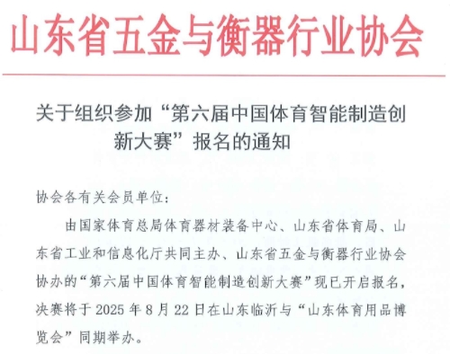 鲁网7月5日讯 近日,山东省五金与衡器行业协会发布通知,宣布由国家体育总局体育器材装备中心、山东省体育局、山东省工业和信息化厅共同主办,山东省五金与衡器行业协会协办的“第六届中国体育智能制造创新大赛”现已正式开启报名。本届大赛决赛将于2025年8月22日在山东临沂与“山东体育用品博览会”同期举办。