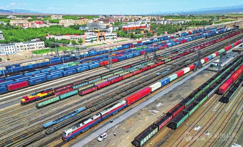 6月24日,在阿拉山口站编组场内,出入境中欧(中亚)班列及其他货运列车正在编组(无人机摄)。今年截至目前,经阿拉山口铁路口岸通行的中欧(中亚)班列超过3600列,累计通行数量达4.6万列。