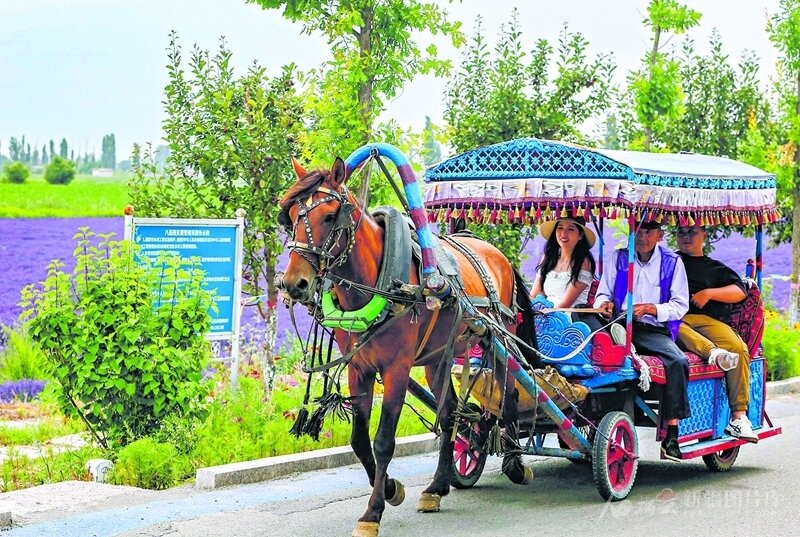 6月20日,游客在霍城县芦草沟镇四宫村坐马车参观薰衣草花田。如今,依托1.2万亩薰衣草花海资源,该村走出一条集“薰衣草生产加工、观光旅游、餐饮住宿”为一体的融合发展之路。