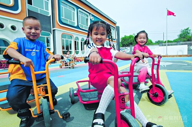 6月25日,裕民县第三幼儿园小朋友在游乐场骑车玩耍。
