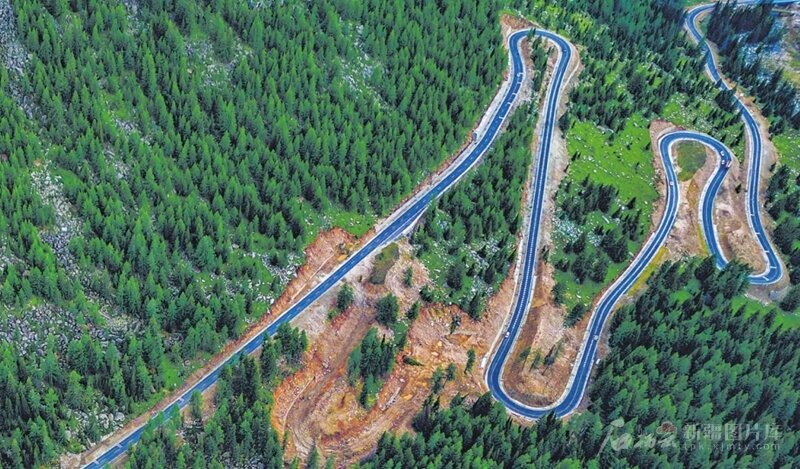 7月1日,车辆行驶在阿禾公路上(无人机摄)。该公路全长209.45公里,连接阿勒泰市与布尔津县禾木喀纳斯蒙古族乡禾木村。从空中俯瞰,这条路就像一条玉带缠绕在阿尔泰山的沟壑间。