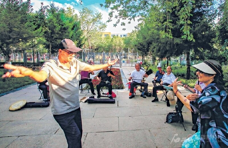 7月3日,吉木萨尔县北庭园里,市民伴随着欢快的音乐翩翩起舞。