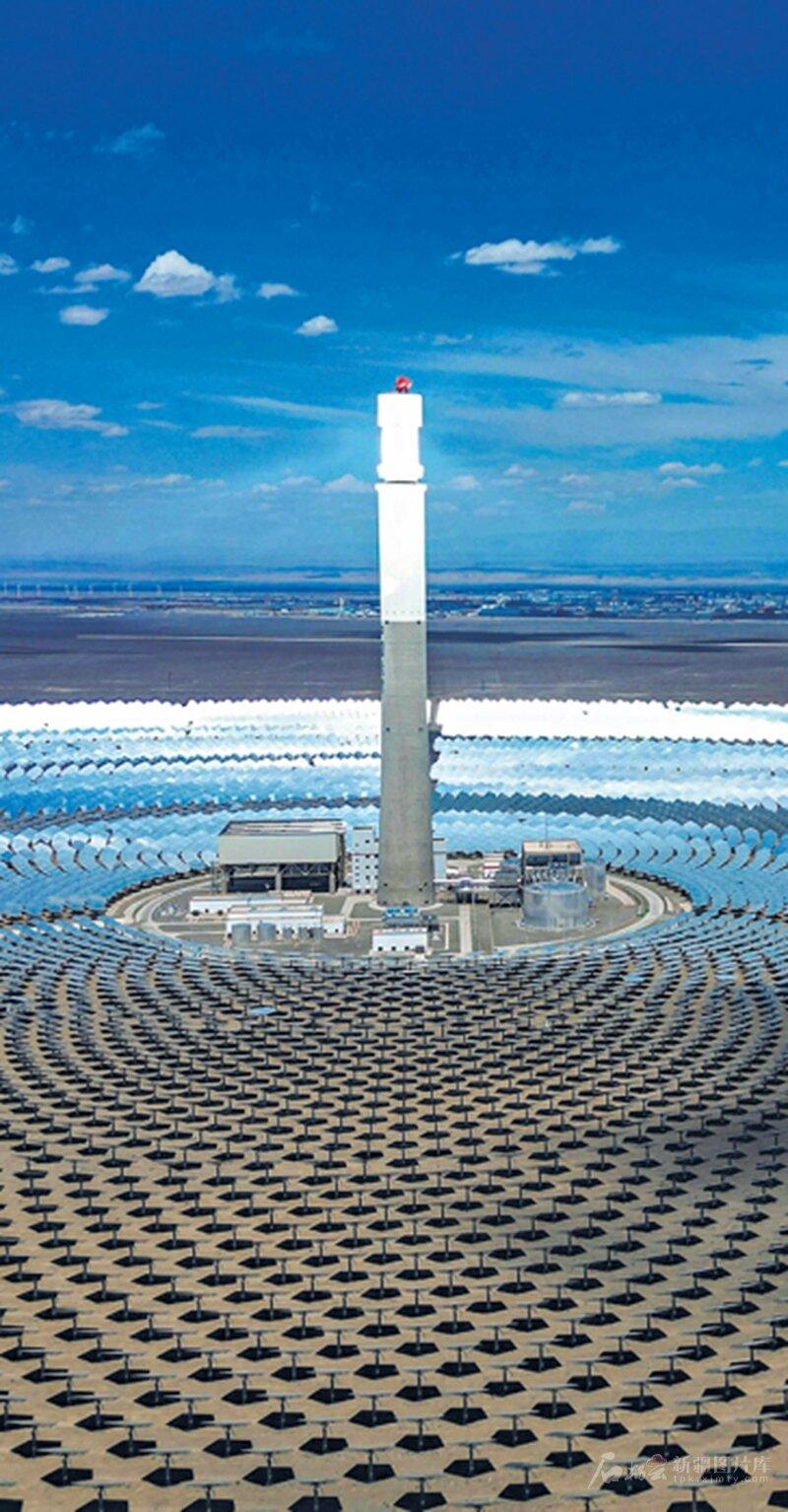 俯瞰伊吾县淖毛湖镇中国能建哈密熔盐塔式5万千瓦光热发电站(7月8日无人机摄)。该电站是全国首批20个光热示范项目之一,2019年并网发电,采用熔盐作为吸热、储热介质的塔式聚光集热技术,可实现昼夜连续发电。