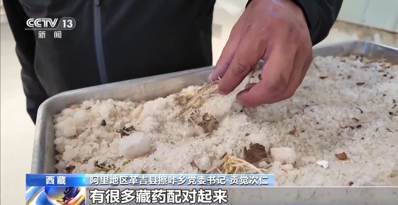 阿里地区革吉县擦咔乡党委书记 贡觉次仁:这个就是足疗盐的原料,除了盐以外还有很多藏药,将原料先做初步的粉碎,然后进行混合,最后磨成跟面粉一样。