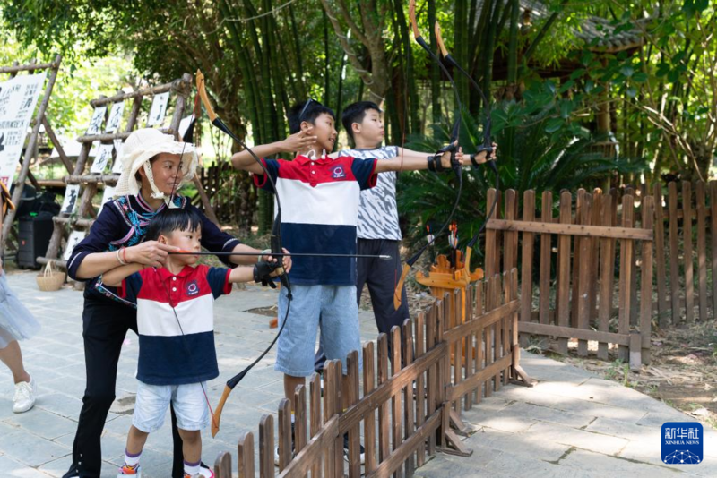 8月24日,游客在云南省广南县坝美村体验射箭。
