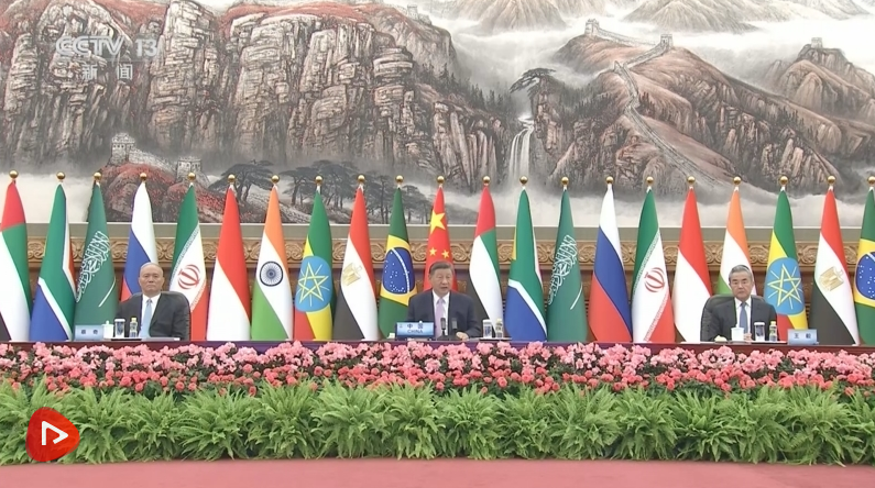 交得其道,千里同好;固于胶漆,坚于金石。金砖各国要以坚韧不拔之志、敢为人先之勇、识变应变之谋,把金砖打造成促进全球南方团结合作的主要渠道、推动全球治理变革的先锋力量。要坚持多边主义,捍卫国际公平正义,维护以联合国为核心的国际体系和以国际法为基础的国际秩序,积极推进国际关系民主化,着力提升全球南方国家的代表性和发言权。要坚持开放共赢,维护国际经贸秩序,坚定不移推动构建开放型世界经济,维护以世界贸易组织为核心的多边贸易体制,抵制一切形式的保护主义,倡导普惠包容的经济全球化,将发展置于国际议程的中心位置。要坚持团结合作,凝聚共同发展合力,携手应对外部风险挑战,在经贸、金融、科技等领域打造更多合作成果,更多更好惠及各国人民。