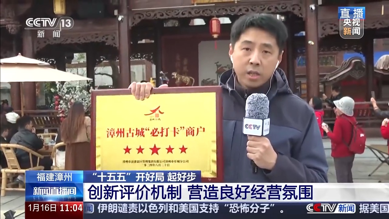 此外,我们还注意到一个细节。这里有一些商家,获得了这样一种带有星级评价的奖牌。这是漳州古城联合了当地文旅、商务、市场监管等部门共同授予。目前,当地相关部门每两年都会对古城内的商户开展文明诚信经营示范评选,经过线上投票、现场考察、线下评分等环节,上榜单位将得到漳州当地有影响力的公众号、视频号等的推广支持,不仅让精品商铺能够出圈,提升古城的游客流量,也激励其他商户,来共同营造良好的经营氛围。
