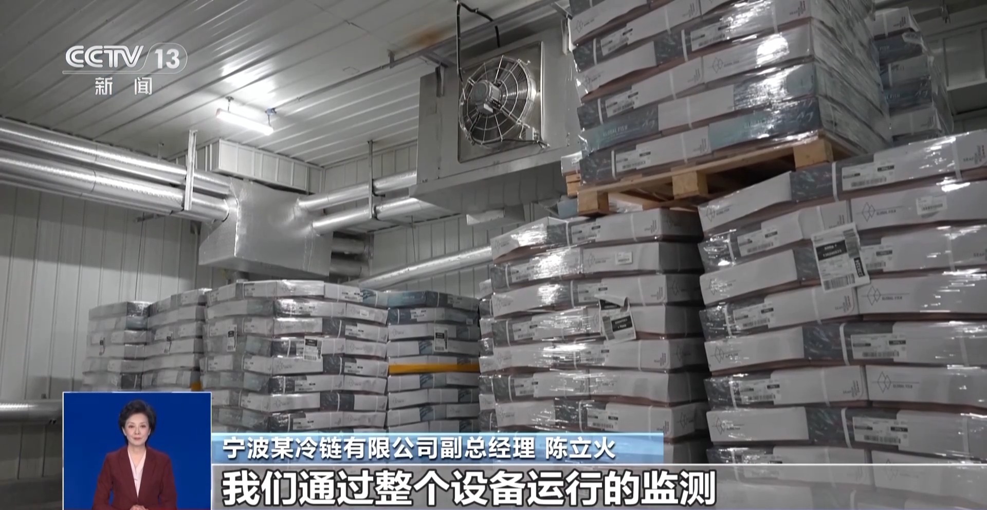 宁波某冷链有限公司副总经理 陈立火:从进口商品上来讲,我们从原来存储的十几种单品,到现在已经跃升到几十种单品,包括新西兰的青口贝、智利的帝王蟹。我们通过整个设备运行的监测、温度的实时监测,保障年货的品质。