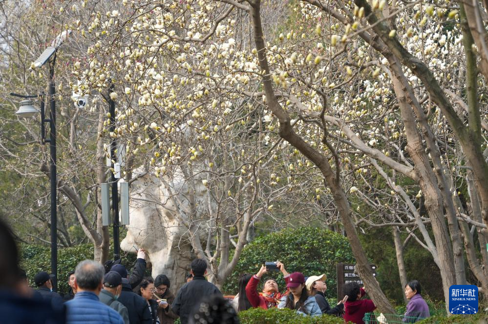 近日,山东省济南市百花公园内的玉兰花陆续开放,吸引众多市民前来踏春赏花。