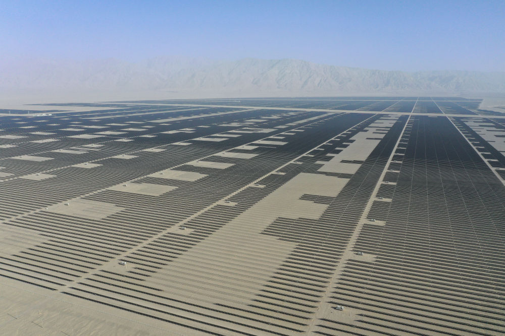 驱车行驶在巴音郭楞蒙古自治州若羌县境内的塔克拉玛干沙漠边缘,浩瀚沙海中,一片片深蓝色光伏板如波浪般铺展至天际。这里是一处400万千瓦光伏项目现场。