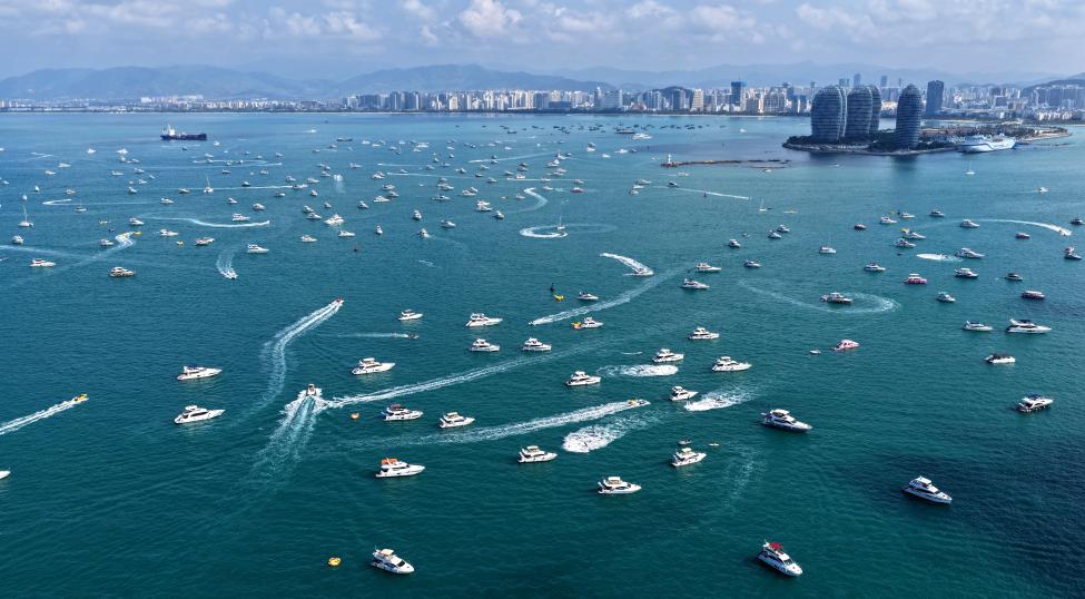 2月21日,游客在三亚乘船游玩(无人机照片)。新华社记者 赵颖全 摄