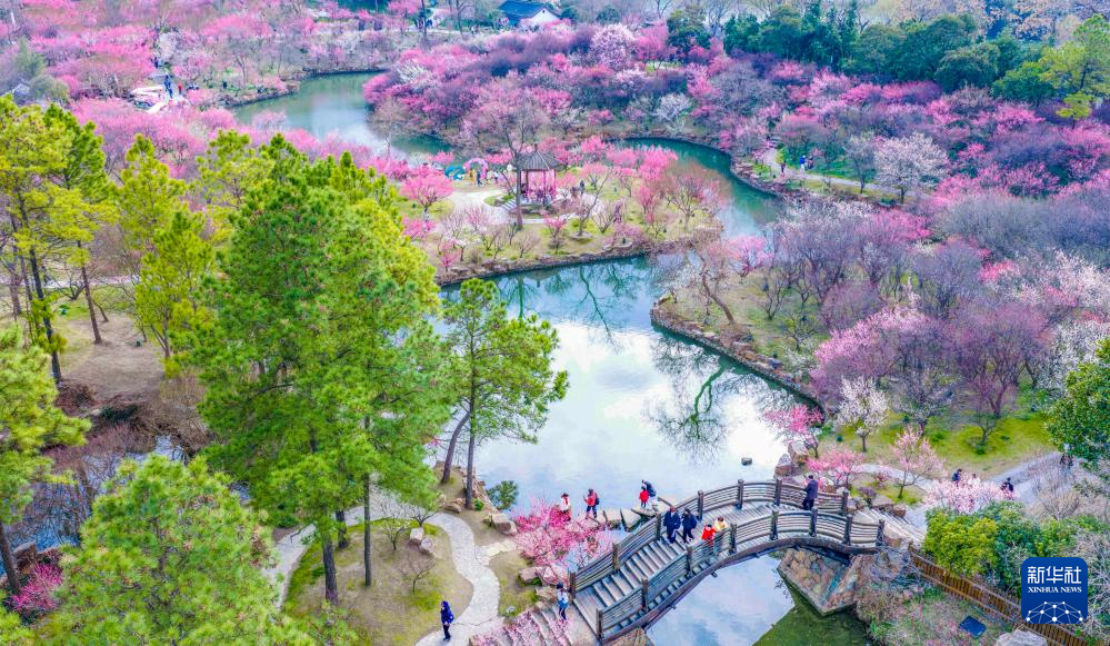 2月25日,游客在江苏扬州瘦西湖风景区赏梅游玩(无人机照片)。