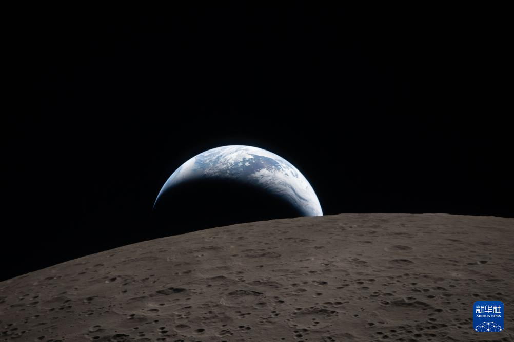 这是4月6日从执行“阿耳忒弥斯2号”载人绕月飞行任务的“猎户座”飞船上拍摄的月球(前)和地球。