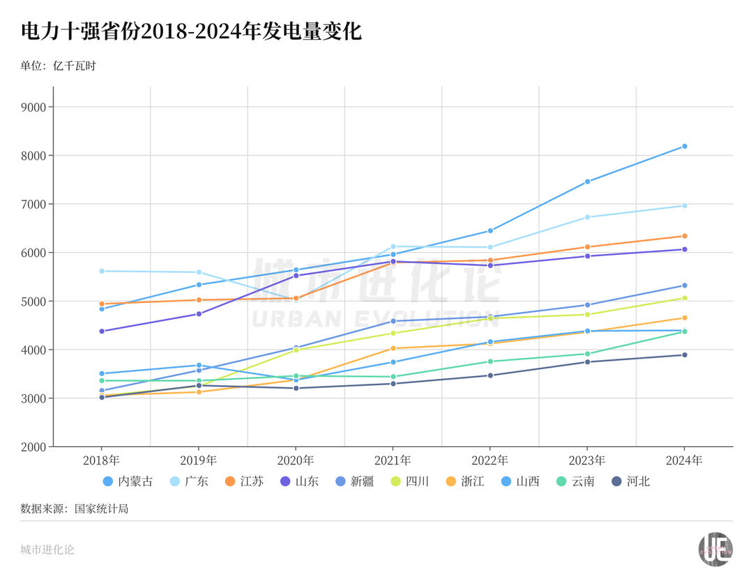 回顾过去五年,国家统计局数据显示,2024年内蒙古是发电量唯一超过8000亿千瓦时的省份,广东、江苏、山东处于6000亿千瓦时阶段,新疆、四川处于5000亿千瓦时阶段,浙江、山西和云南处于4000亿千瓦时阶段,河北也在逼近4000亿千瓦时阶段,这些省份共同构成全国前十的发电大省。