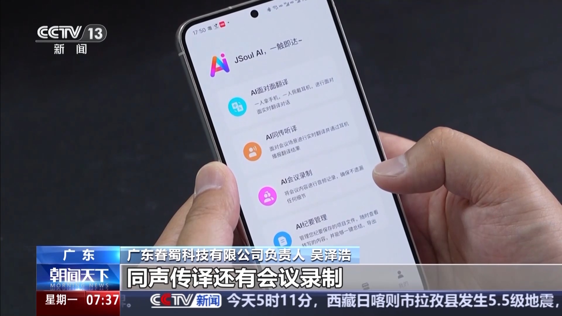 广东眷蜀科技有限公司负责人 吴泽浩:AI方面的植入是一个全新的东西,跟我们之前投到美国的产品是完全不同的,其中包括面对面的翻译、同声传译,还有会议录制。
