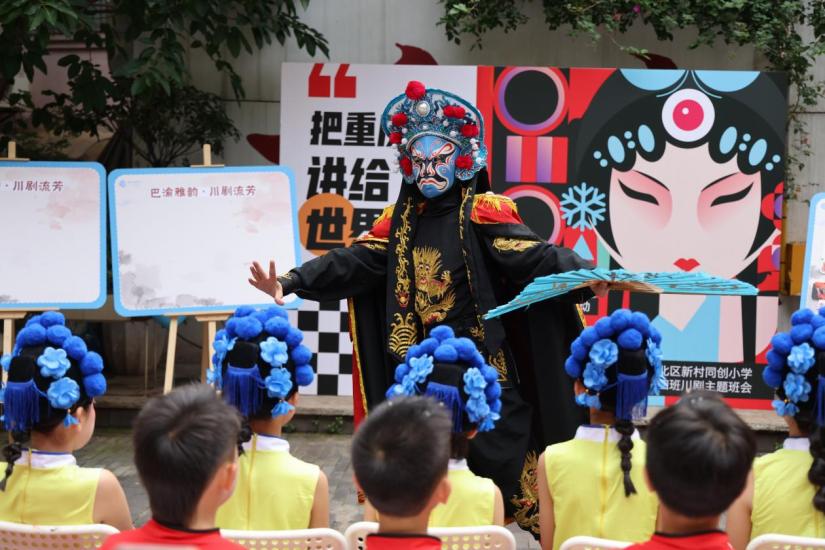 活动伊始,江北区新村同创小学以“非遗・戏曲・传承”为主题开展川剧主题班会。内容涵盖川剧的历史渊源、艺术特点、经典剧目赏析等环节。小演员们化身"生旦净末丑",特别是"刀马旦"的精彩唱段引得留学生们连连鼓掌,纷纷举起手机记录。当川剧演员展示"一秒变脸"绝技时,现场惊呼不断,留学生们直呼"不可思议"。
