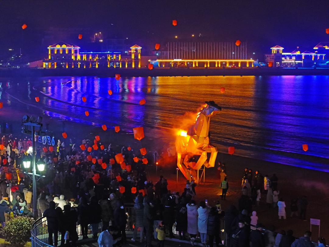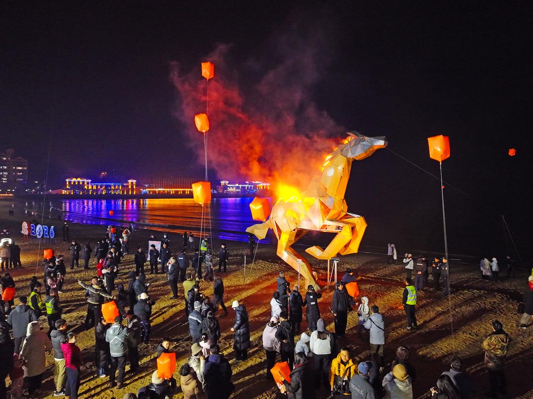 夜幕降临,“赤骥腾春 好运环翠”2026新春嘉年华活动准时开演,主题光影秀、非遗鱼灯巡游、打铁花等节目轮番上演,营造出滨海“不夜天”的热闹景象。尤其是“赤骥腾春”艺术灯光秀,将奔驰的赤骥与灯光、烟雾融合,呈现出富有视觉冲击力的艺术景观。“这个装置主体由废旧钢铁、快递箱纸壳等回收材料构建而成,体现了绿色环保的理念。”赤骥设计师郑旭光介绍。