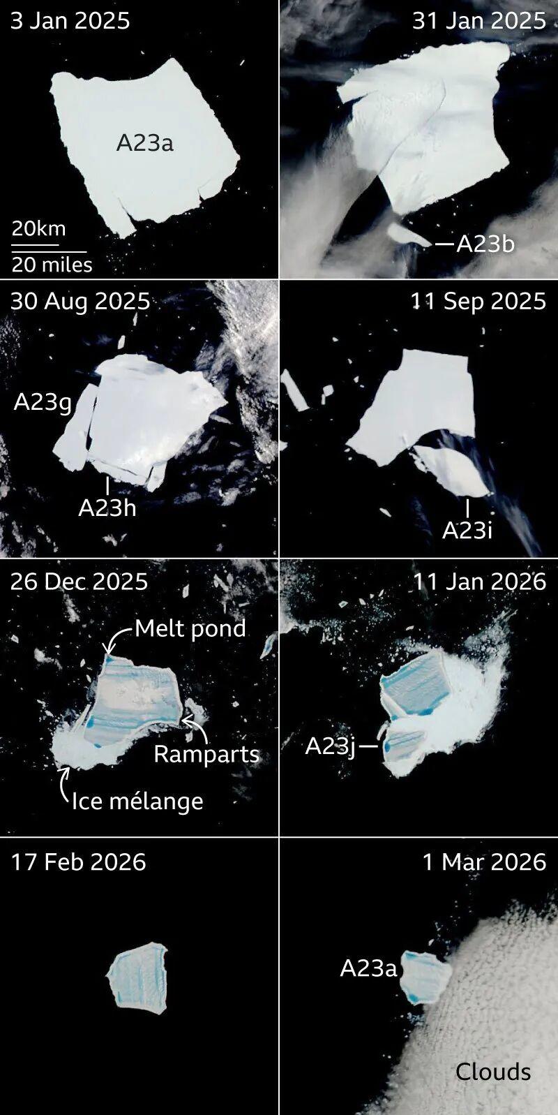 ·2026年1月,A23a再次发生崩解,其主体面积仅余503平方公里。